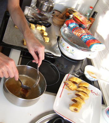Mientras preparar el almibar para bañarlos enseguida después de la cocción.