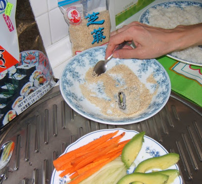 Después cubrí el arroz con una hoja de nori y sobre ella coloqué el relleno: bastones de palitos de cangrejo y bastones de aguacate.