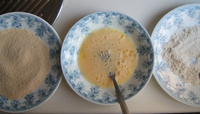 Pasar las berenjenas primero por harina, luego por el huevo y por último por el pan rallado.